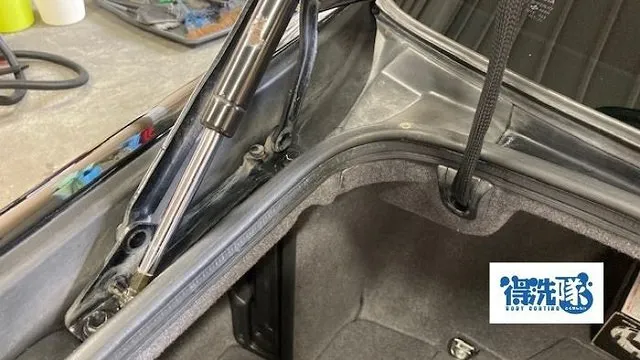 プレミアムコーティングでは鏡面研磨を行った後にガラスコーティング剤の塗布を行います。その為、鏡面研磨の際に研磨したくないメッキモールや樹脂パーツ、エンブレム等をマスキングテープを使って事前に保護していきます。