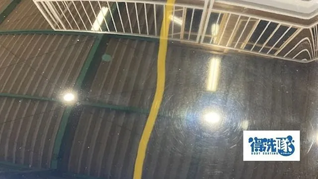 写真の黄色線左側が研磨済で、右側が未研磨状態です。ボンネットに反射するライト付近を確認すればその違いは一目瞭然かと思います。