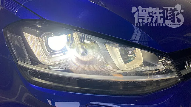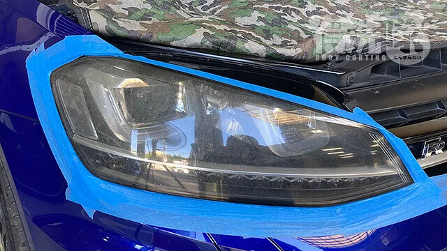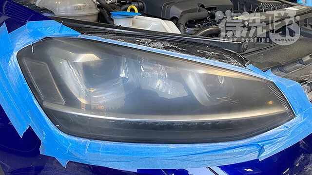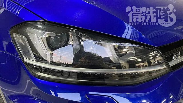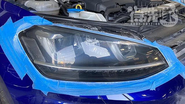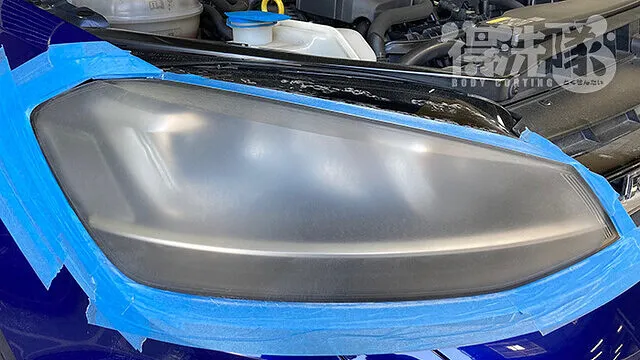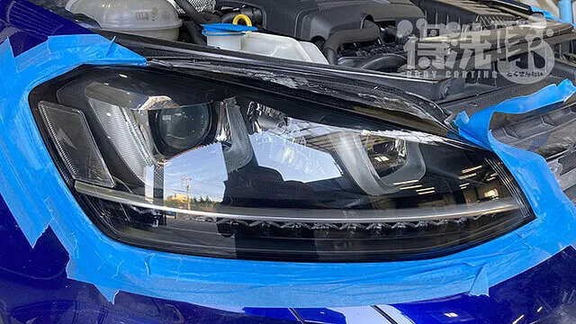 用品店等で市販されているヘッドライトクリーニング剤は、いわゆる「コンパウンド」と呼ばれる研磨剤になります。コンパウンドのみでの研磨では多少の黄ばみの除去は行えますが、クラック除去を行おうとするとヤスリが必要になります。そこで得洗隊のヘッドライトクリーニングですが、ヤスリとコンパウンドの2種類を用いて行います。その為ボディにキズをつけてしまわないよう、施工前にはマスキングテープ等で「フチ」の箇所を何重にも保護してから研磨を開始します。