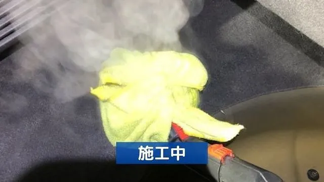 洗浄クリーニング済みのカーペットなどに100℃以上になる高温スチームを当てていきます。