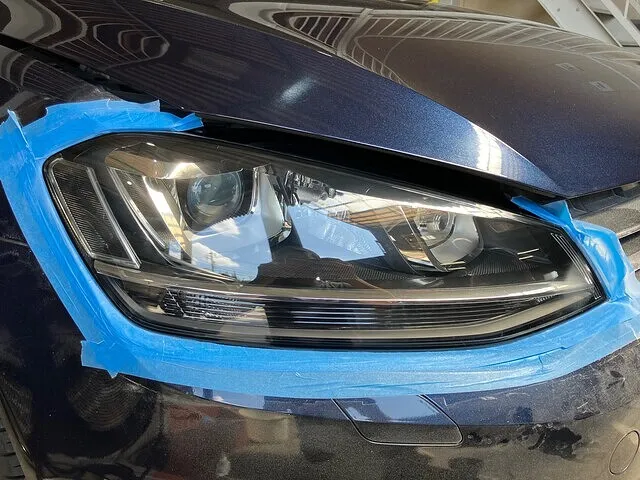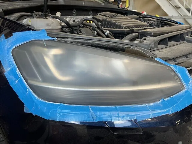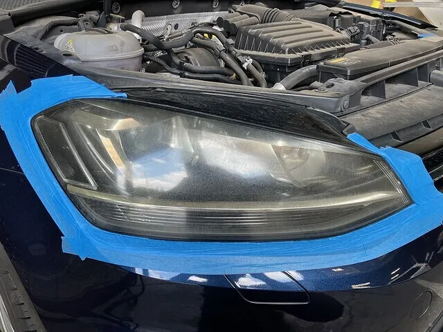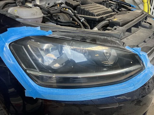 そこで得洗隊のヘッドライトクリーニングですが、ヤスリとコンパウンドの2種類を用いて行います。その為ボディにキズをつけてしまわないよう、施工前にはマスキングテープ等で「フチ」の箇所を何重にも保護してから研磨を開始します。