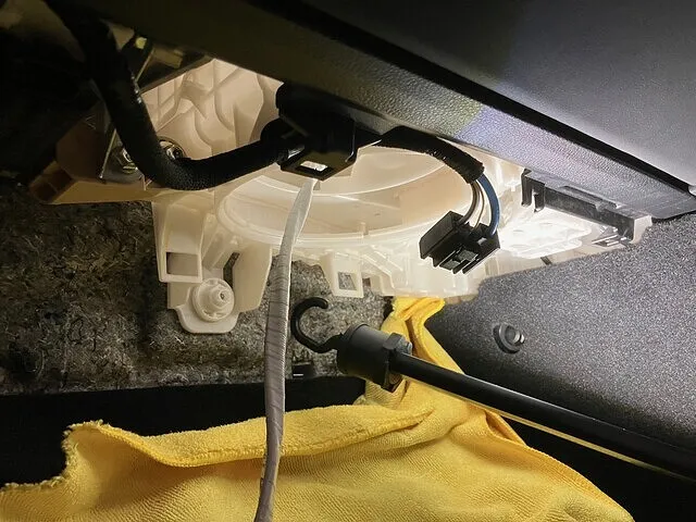 まずはグローブボックス、エアコンフィルター、パネルを取り外し、空気の吸入や排出を行うブロアモーターを取り出します。そこから専用機材を挿しこみ、洗浄の準備完了となります。洗浄の際には付近を汚してしまわないよう養生を行います。