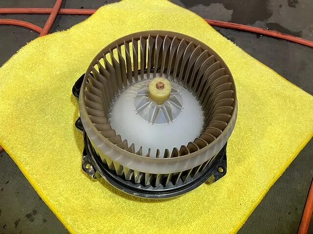 洗浄前に取り出したフロントのブロアモーターはかなり煤けて汚れてしまっていた上にヤニ汚れが酷く付着している状態でした。羽を折らないように気をつけながら、丁寧に1本ずつ清掃します。リアのブロアモーターは取り外せる構造ではなかったので洗浄は行えませんでした。