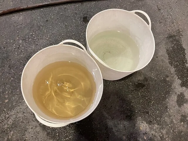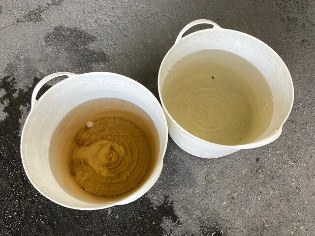 噴霧したクリーナーは汚れと一緒に汚水となってドレン口から流れ出てくるので、バケツで受け止め汚れ・洗浄具合を確認していきます。かなり汚れてしまっているようでしたので、洗浄を繰り返し行った後にエバポレーターのすすぎ洗いを行いました。
